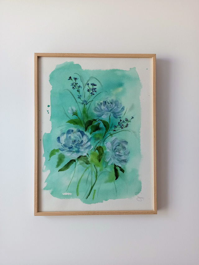Découvrez la poétique aquarelle "Fleurs Bleues". Cette œuvre colorée capture un bouquet de fleurs dans des tons bleus, inspirés des fleurs sauvages et des dahlias, avec un fond flou de bleu vert. Mesurant 30x40 cm, cette aquarelle évoque la beauté et la délicatesse de la nature. Vendue dans un cadre aluminium bois de 51x41 cm, cette pièce ajoutera une touche d'élégance à votre intérieur.