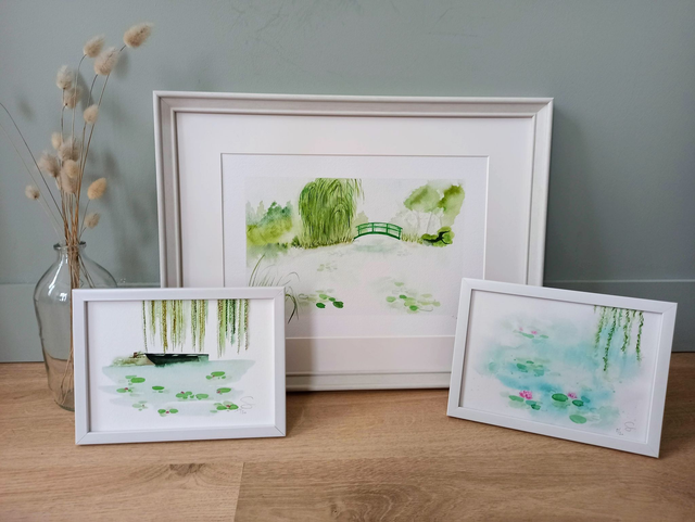 L'aquarelle "Giverny" s'inspire des célèbres peintures de Claude Monet du même nom, capturant la sérénité et la beauté intemporelle de ses jardins à Giverny. Le point focal de la peinture est un magnifique étang orné de nymphéas aux couleurs éclatantes, flottant paisiblement à la surface de l'eau. En arrière-plan, des saules pleureurs étendent leurs branches délicates au-dessus de l'étang, créant une atmosphère de calme et de sérénité, tout comme dans les œuvres de Monet. Les couleurs douces et lumineuses utilisées dans la composition évoquent un sentiment de paix et d'harmonie.