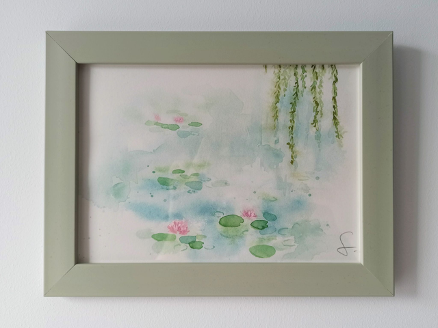 "L'aquarelle Nymphéas" est une pièce poétique qui vous transporte dans un monde de douceur et de tranquillité, inspirée par les célèbres tableaux de Claude Monet. Cette œuvre mesure 13x18cm, elle est présentée dans un cadre vert d'eau de 21x16cm, évoquant la quiétude des étangs de nymphéas. Plongez dans la beauté éthérée de cette composition florale et laissez-vous envoûter par la magie des couleurs et des reflets. Une invitation à découvrir la poésie de la nature dans toute sa splendeur. Cette pièce fait partie du triptyque, accompagnée des aquarelles "Giverny" et "Barque dans le Jardin Anglais", créant ainsi une harmonie artistique et une immersion totale dans l'univers féérique de Giverny.