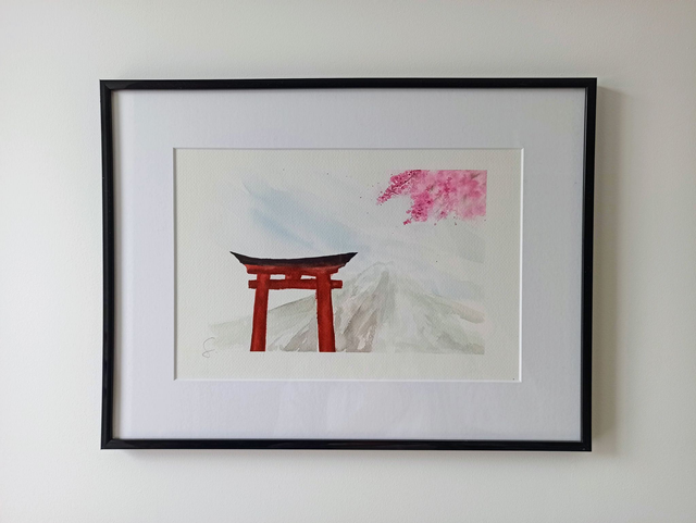 Découvrez la tranquillité du printemps japonais avec notre aquarelle originale 'Torii au Printemps'. Cette pièce capture l'essence sereine du paysage japonais, mettant en vedette un Torii majestueux surplombant le Mont Fuji en arrière-plan. Les teintes douces de la scène sont subtilement éclairées par les fleurs de cerisier en fleur, ajoutant une touche délicate à cette composition. Mesurant 30x21cm et encadrée dans un cadre en aluminium noir de 41x31cm, cette aquarelle est un ajout saisissant à toute collection. De plus, elle forme un triptyque captivant avec nos autres œuvres 'Mont Fuji au Printemps' et 'Fukuoka au Printemps', offrant une immersion complète dans la beauté éphémère du Japon au printemps.